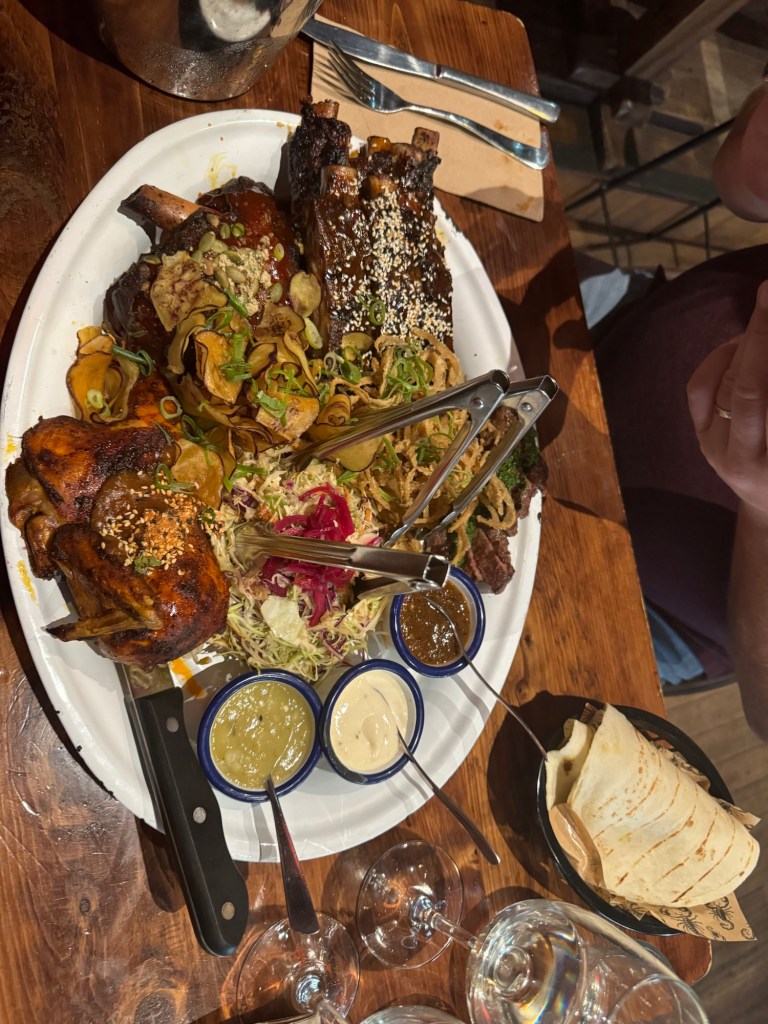 A quick afternoon spent in Christchurch before the early Transalpine train the next morning. We come back to Christchurch for a bit longer at the end of the honeymoon. Lots of new buildings/ restoration after the many earthquakes here in the early 2010s. Paul’s eyes were bigger than his belly for dinner hence all the take away boxes.