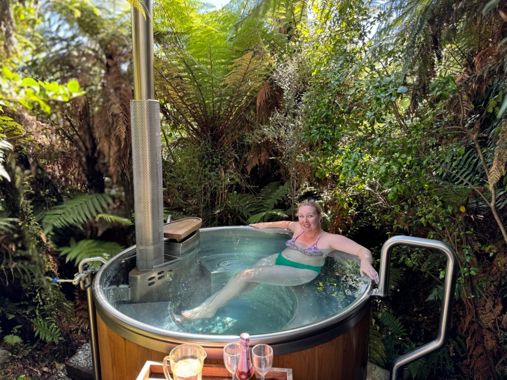 Glacier central. Franz Joseph & Fox Glacier with a little stop off to Lake Matheson to check out the views. All that walking earned us a little treat in the log burner hot tub, putting ideas into Paul Williams head for our 1st anniversary present.
